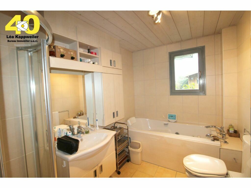 WC séparé, salle de bains avec baignoire, douche, lavabo encastré et WC